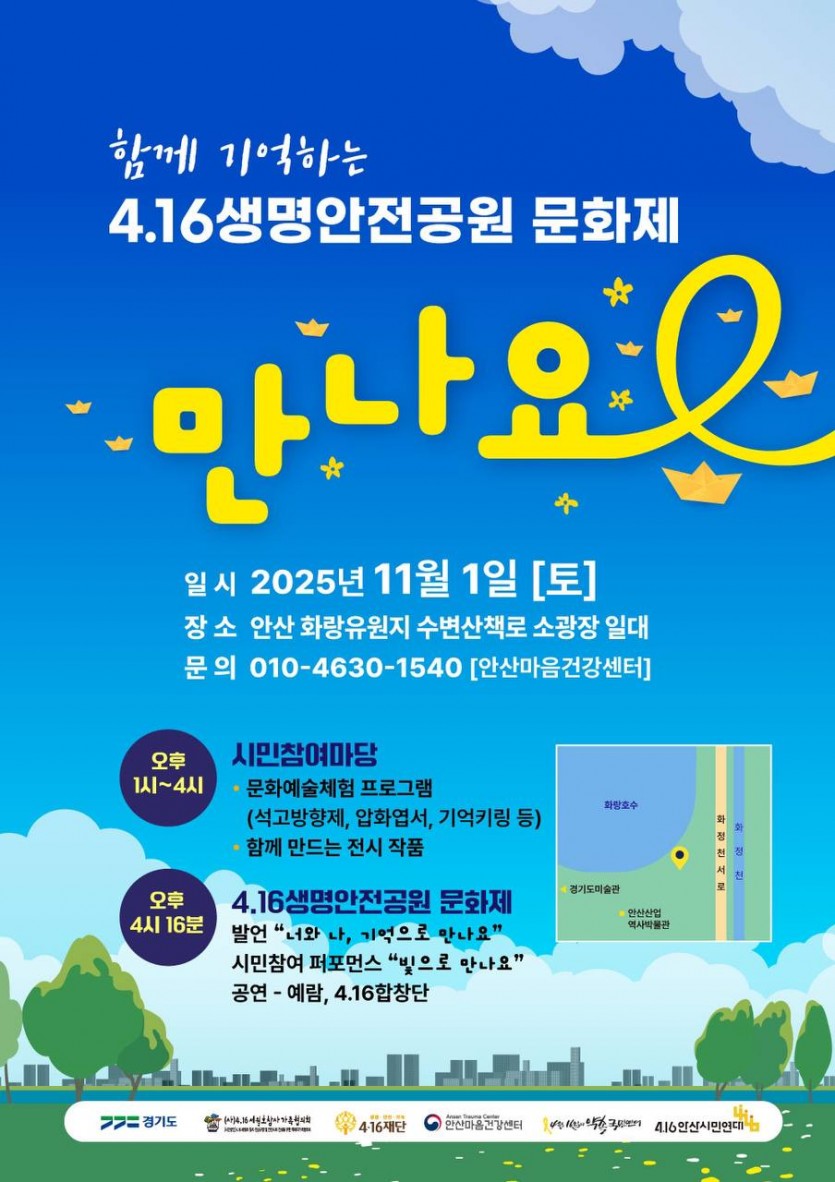 [함께해요} 함께 기억하는 4.16생명안전공원 문화제 “만나요” 페이지 정보 등록일 2025-10-14 작성자 관리자 조회수 9 회 본문 함께 기억하는 4.16생명안전공원 문화제 “만나요”11월 1일 토요일, 특별한 오후. 별이 된 아이들을 만나러 가는 길.생명존중과 안전사회의 이정표가 될 4.16생명안전공원에서 너와 나, 기억으로 만나요. 우리, 빛으로 만나요. 다음글 416합창단 2025-2026 찾아가는 기획공연 25.10.14 목록